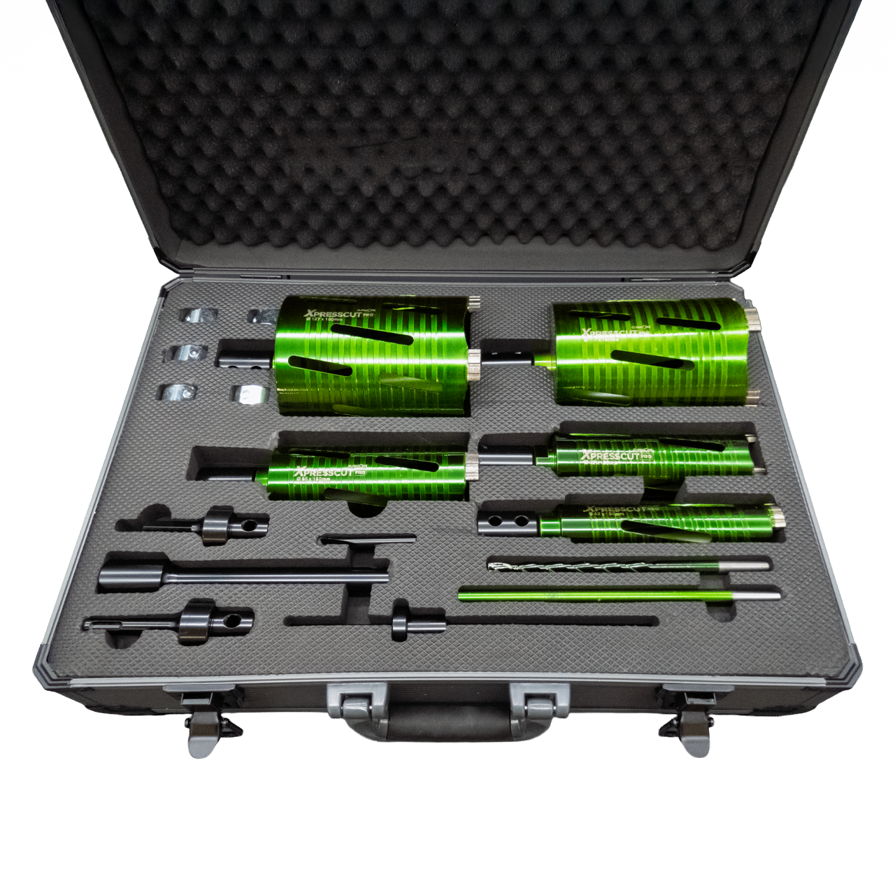 Including 42mm, 52mm, 65mm, 117mm, and 127mm XPRESSCUT PRO dry diamond core bits. These cores feature laser-welded diamond teeth and spiralled barrels for clean, fast cutting through tough materials like aggregate concrete and clay products. It also comes complete with everything you need to get started, including Core Adaptors for each bit, a HEX and an SDS extension bar, and quick-release clips. Other essential Accessories Included in the kit also contains are a guide pin, a pilot drill, a drift key, and the indispensable Clipacore Knock Out Tool for safe waste removal.